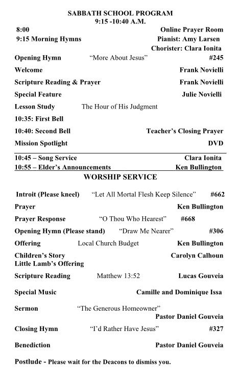 - Sabbath Prayer Video Chat 8:00 am https://meet.google.com/nkj-nzjb-iin