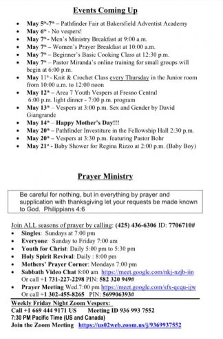 - May 21 Baby Shower for Juan and Regina Rizo’s baby boy; 2:00PM in the Fellowship Hall